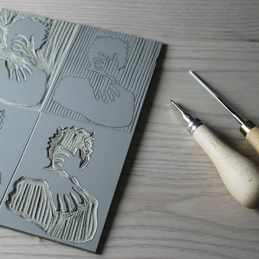 Enfin, j’ai commencé la linogravure pour créer mes tampons personnalisés, et puis, des idées d’illustrations décalées, poétiques me viennent que je grave pour pouvoir (but ultime incontournable ici) les mettre en couleurs !